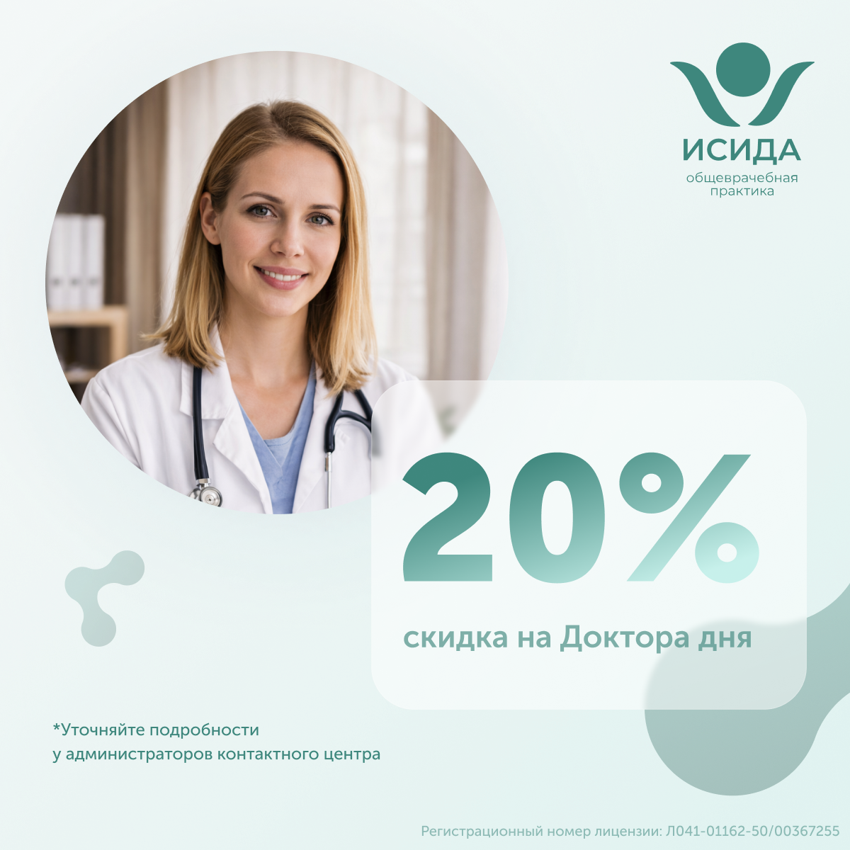 Акция «Скидка 20% на Доктора дня» проводится в медицинском центре «ИСИДА».
