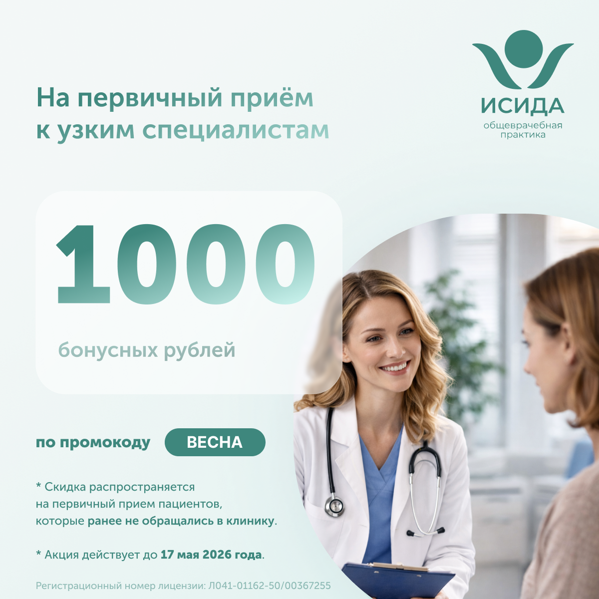 Акция «1000 бонусных рублей на первичный приём к узким специалистам по промокоду ВЕСНА» проводится медицинским центром «ИСИДА».